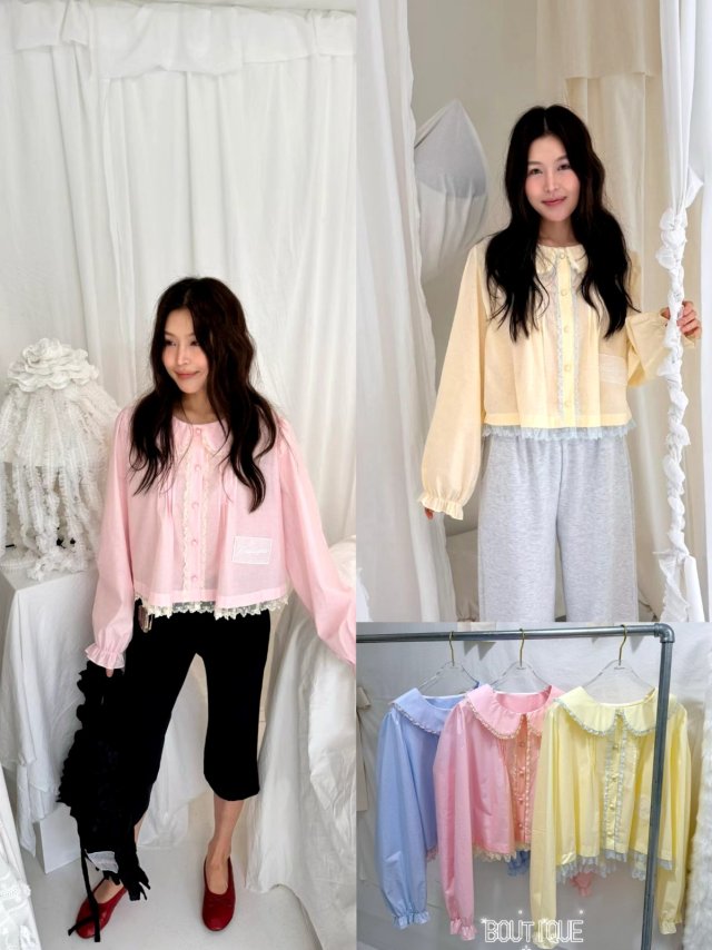 B846 娃娃刺繡網紗邊襯衫