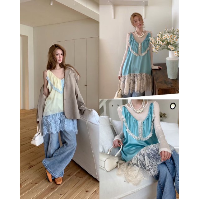 MA133 撞色刺繡蕾絲邊拼布吊帶TOP