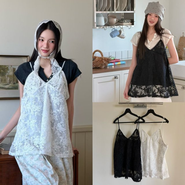 MA134 V領刺繡蕾絲吊帶TOP