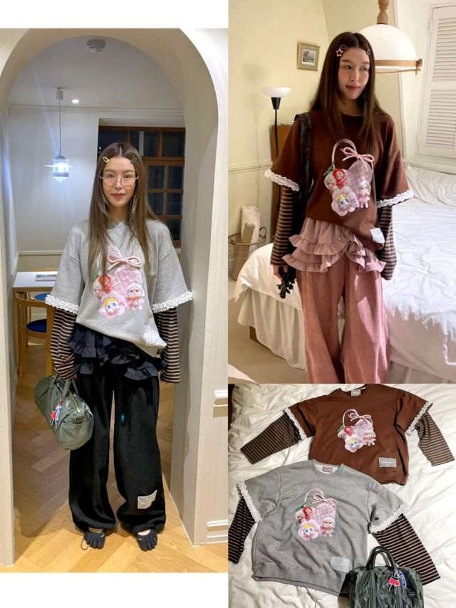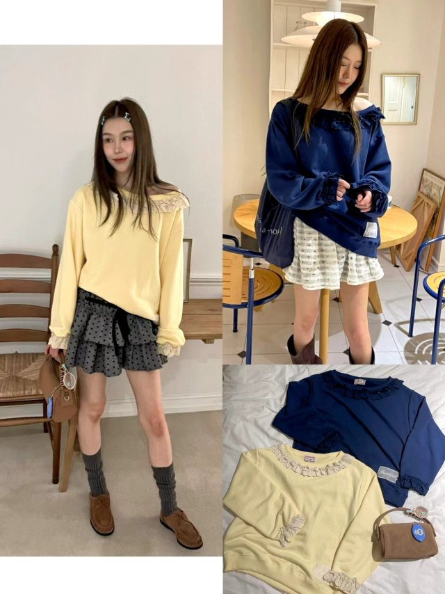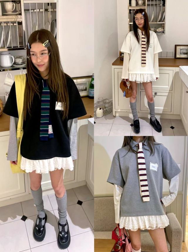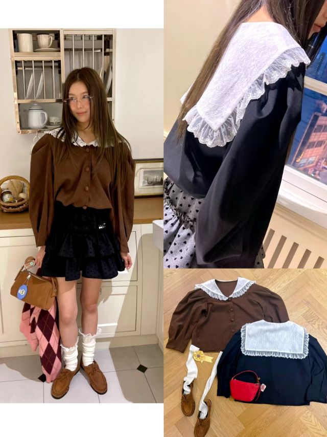 B689 假兩件通花邊校服感Top