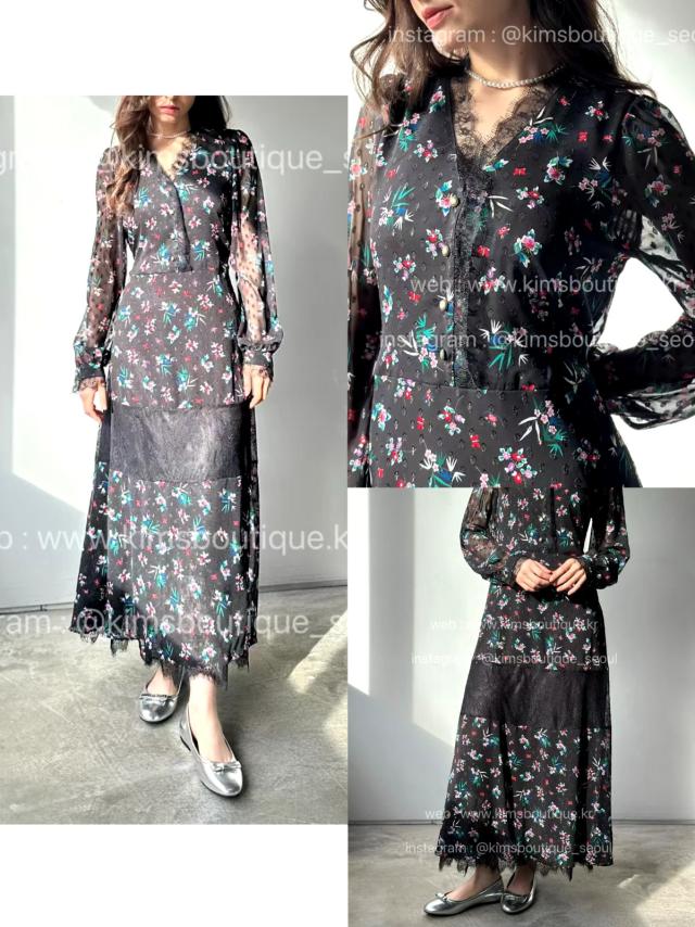 KB357 碎花蕾絲邊v領長袖OP