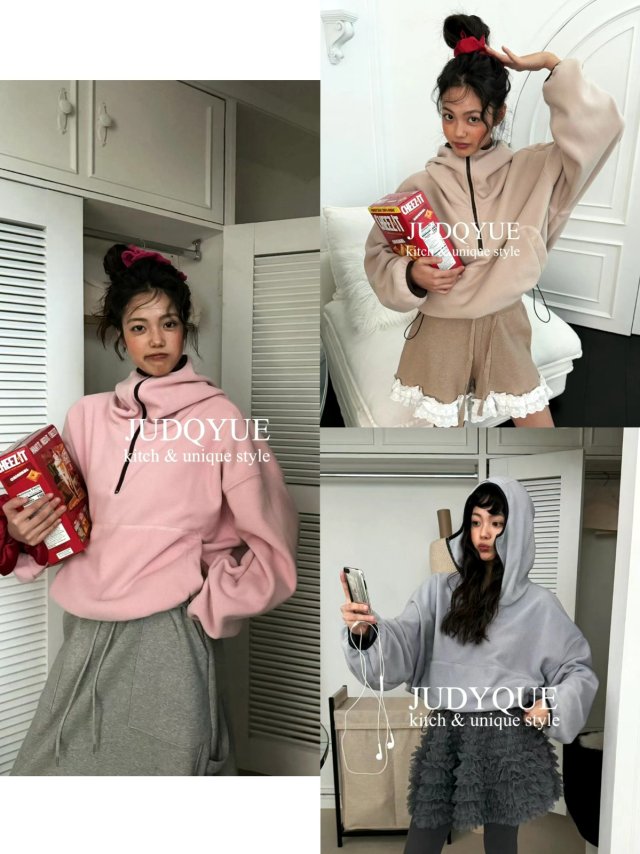 JD357 薄絨運動感拉鍊領連帽上衣