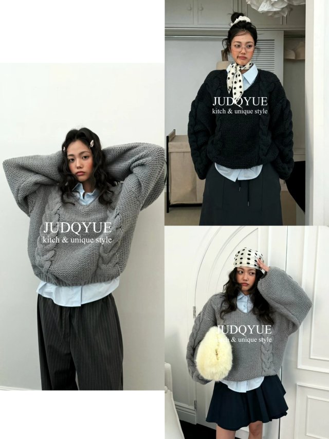 JD358 V領麻花針織假兩件毛衣