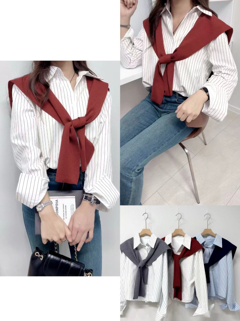 LL05 直紋襯衫拼披肩2件套
