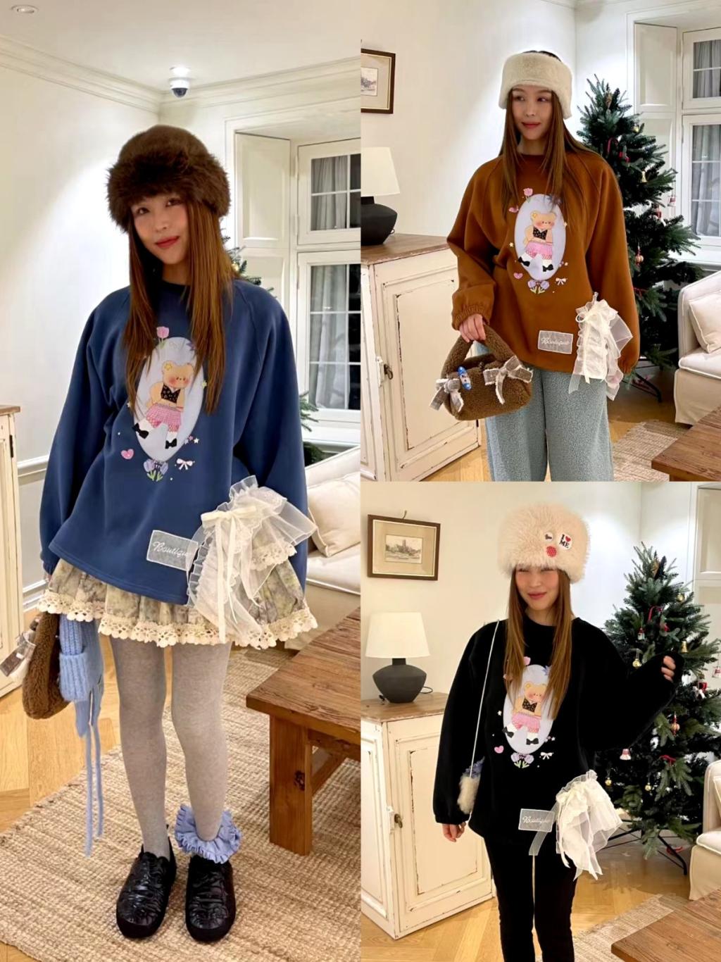 B774 (薄絨)通花紗邊小熊Top