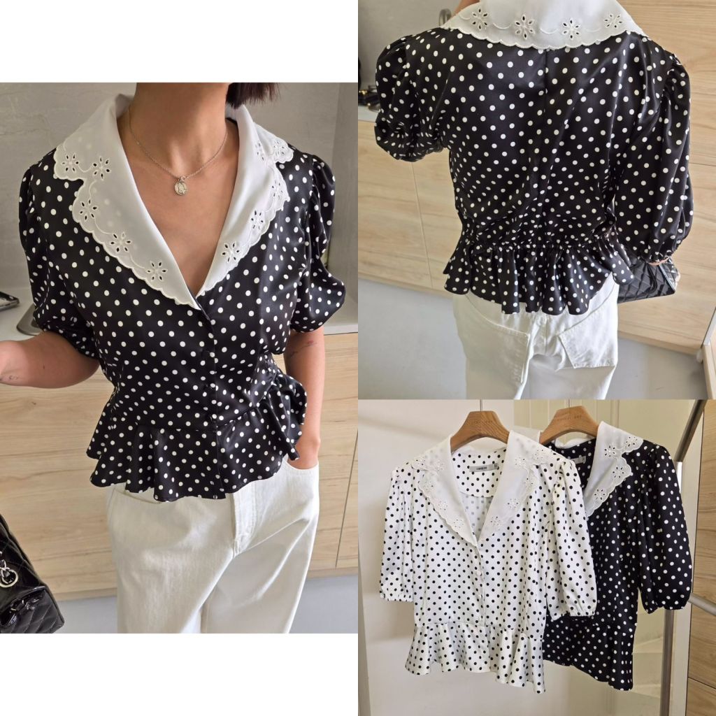 CN63 復古波點鏤空翻領荷葉衫 38/30-35/18 $398