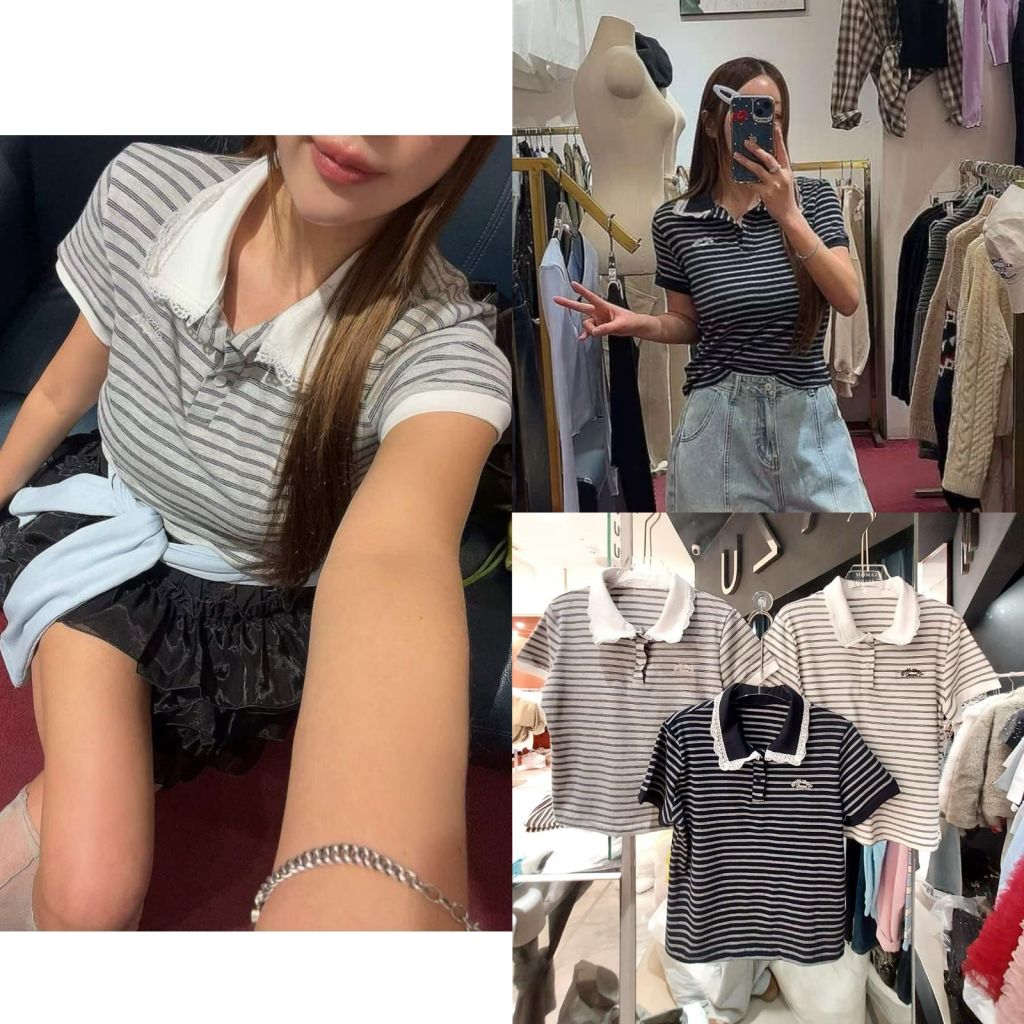 MO42 polo領刺繡蕾絲邊條紋短版TOP 41/20 $290