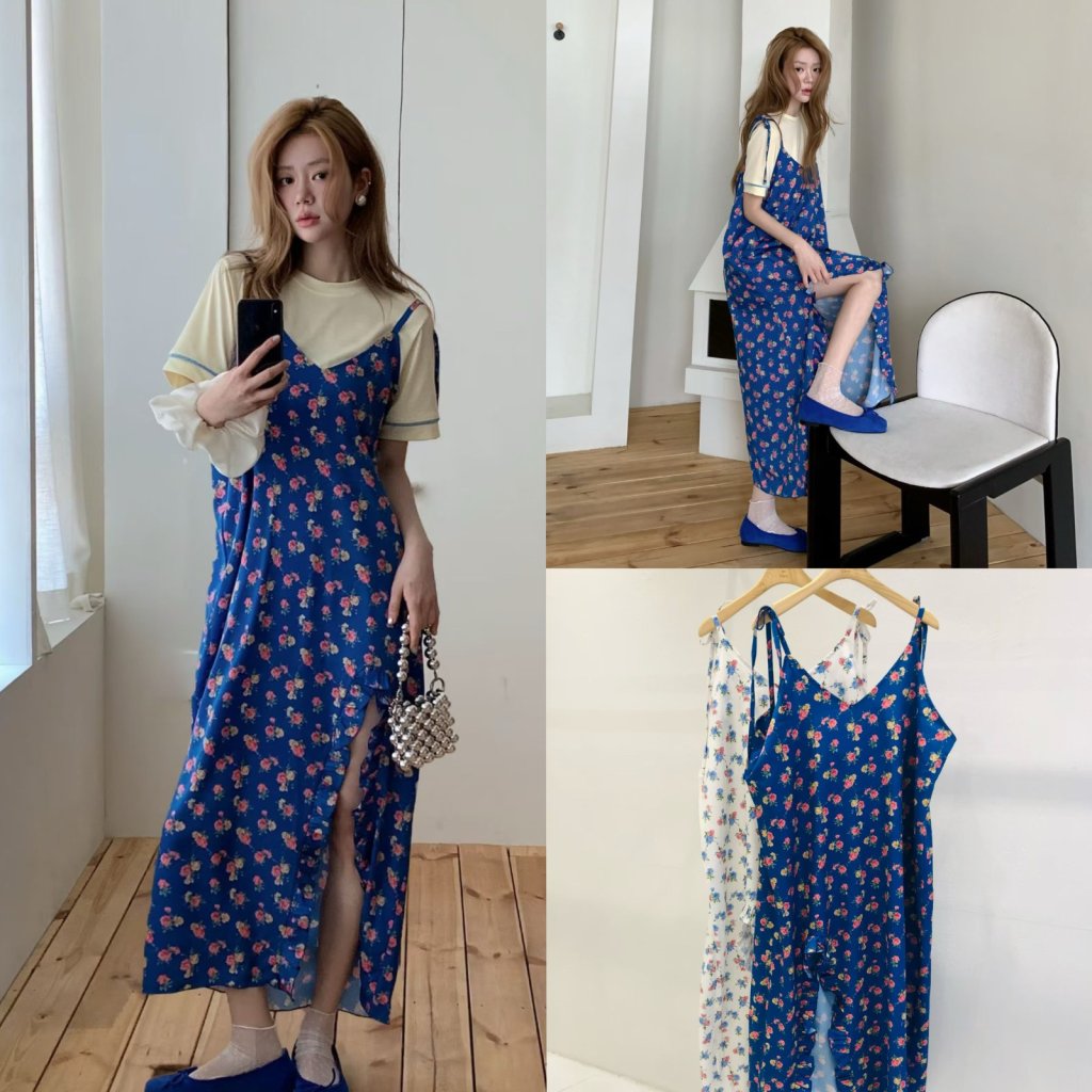MA131 油畫風碎花ruffle邊開叉吊帶OP
