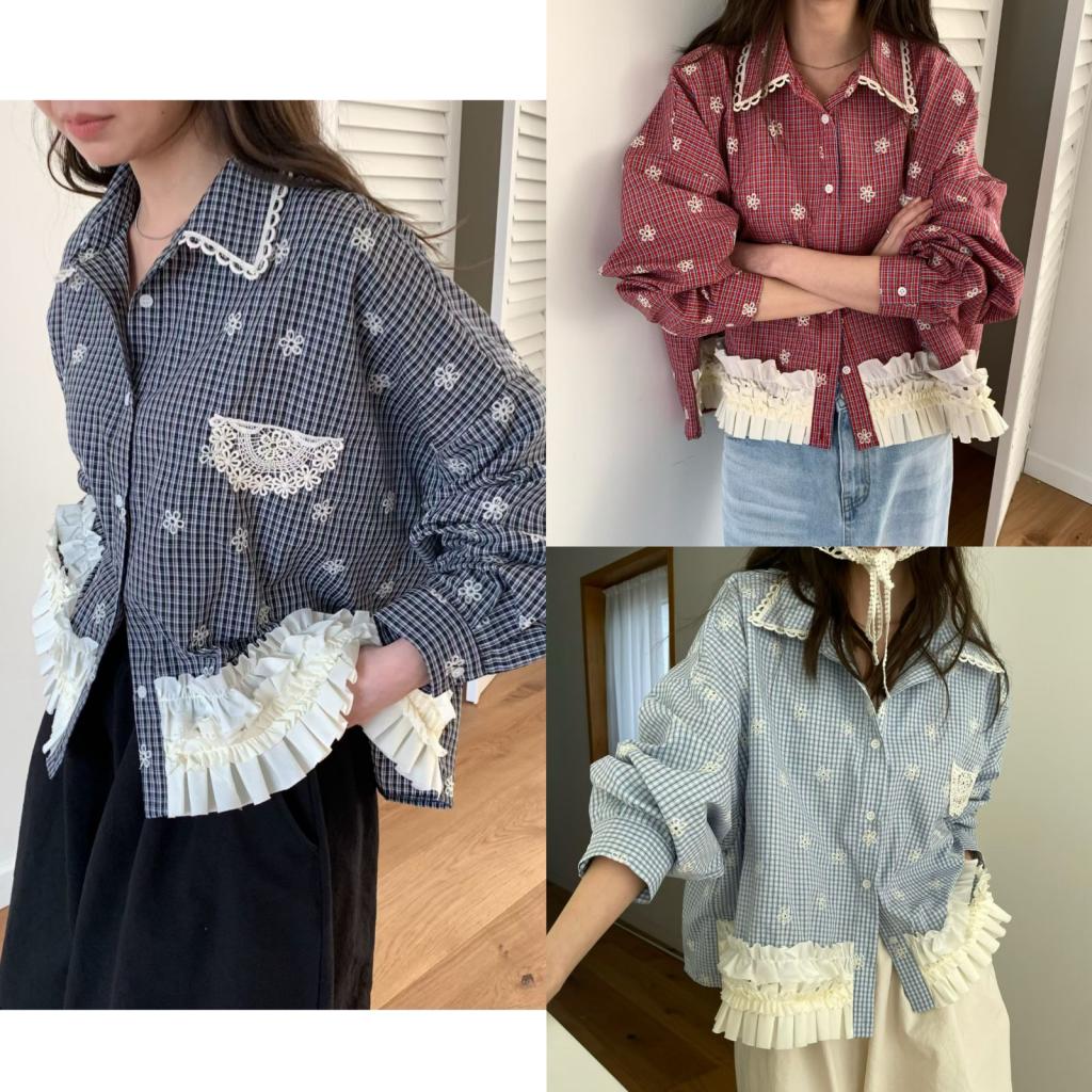 VT540 刺繡線條小花ruffle邊格子襯衫