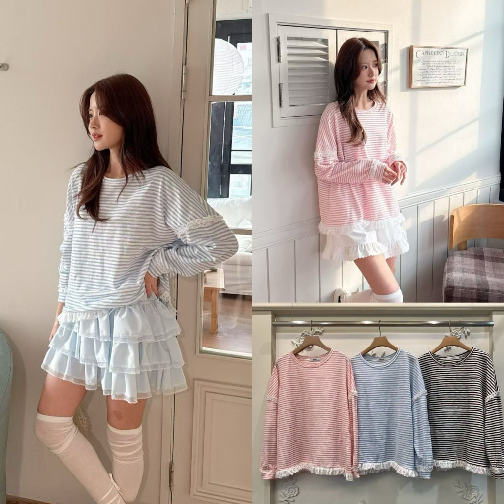 Home BB45 蕾絲小花邊拼色條紋TOP